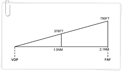 3도 강하각을 기준으로 하였을때 60 대 1 법칙에 의하여 강하율은 300FPNM이 된다. 이제 활주로에서 MDA까지 높이(FT)를 구하고, 구한 높이에 300FPNM을 나누어 주면 위 그림처럼 활주로로 부터 강하시점까지의 거리, 즉 VDP를 구할 수 있다.