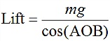 여기서 m은 비행체의 질량, g는 중력가속도를 나타낸다. 위 식을 정리하면 비행체의 무게와 AOB를 알면 양력을 구하는 식을 구할 수 있는데,