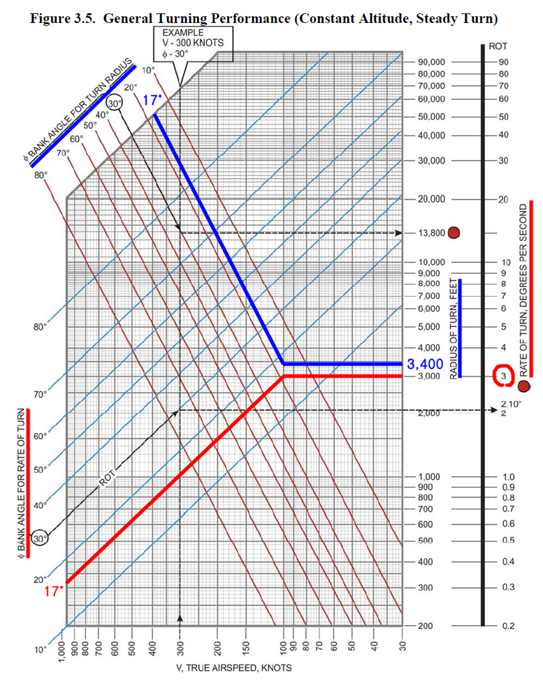 참고로 150KTAS 일때 'General Turning Performance (GTP)차트' 상의 선회반경은 3,500 FT, 즉 약 0.58NM 이며, 이 계산식을 사용했을때는 선회반경이 0.5NM으로 나옵니다. <2020. 7. 14 내용 추가>