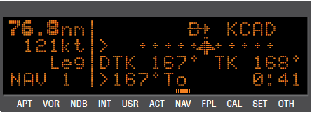 DIRECT-TO 기능은 현재 위치에서 가고자 하는 위치 까지의 방위 와 거리 그리고 ETE와 같은 'NAV'정보를 제공해 주는 기능이다. 위 예시에서는 현재 위치에서 KCAD 공항까지의 거리정보(76.8NM), 트랙정보(DTK 167), 현재 트랙(TK 168), RADIAL정보(167To)등을 나타내고 있다. 이와같이 가고자 하는 위치의 RADIAL 정보와 거리정보를 알 수 있기 때문에 쉽게 DIRECT 하기위한 헤딩을 잡을 수 있다.
