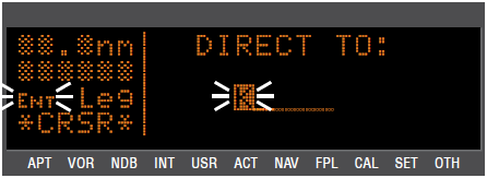 8. CURSOR BUTTON (CRSR) 정보화면에 커서를 생성하고 이를 통해 OUTER/INNER KNOB를 사용하여 여러가지 값을 바꿀수 있도록 해준다. 간단한 일례로 VOR 화면에서 원하는 VOR 이름이나 식별부호 를 입력하여 해당 NAVAID 정보 화면을 띄울 수 있다.