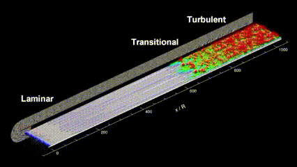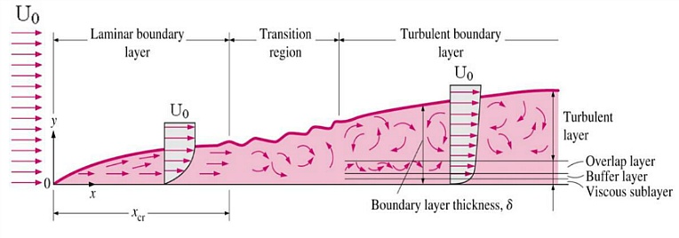 그러나 경계층 내의 유체는 어느정도 물체표면 위를 지나가게 되면 각 층에서의 지속적인 속도차이가 누적되어 흐름의 상하 이동이 생기면서 섞이게 되고(Transition, 천이),