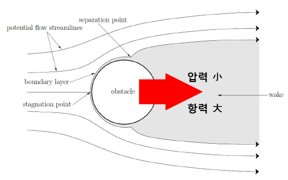 이 때의 항력은 경계층과 물체표면사이의 점성이 만들어 내는 항력과는 근본적으로 다른 '압력항력(Pressure drag 또는 Form drag)'이며 그 영향력도 훨신 큰 편입니다.