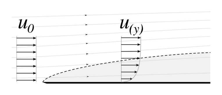위 그림은 유속 u(0)로 흐르는 유체가 매끄러운 물체의 표면위에 흐르게 될 때 점성에 의하여 유속이 u(y)로 바뀌게된 것을 나타낸 그림입니다. 그림에서 점선은 경계층을 나타내며 이 경계층 아래 회색음영으로 표시된 면적이 점성력의 영향이 미치는 영역입니다. 보시다시피 이 영역 안에서는 점성에 의한 저항으로 인해 물체의 표면에 가까워질수록 일정하게 유속이 감소하는 모습을 볼 수 있습니다. 그리고 궁극적으로 물체표면에서는 속도가 0가 됩니다.