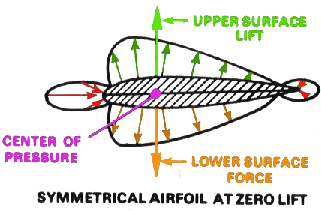 반면 대칭형 에어포일(symmetrical airfoil)의 경우 특이하게도 받음각이 변해도 압력중심의 위치는 변하지 않습니다.
