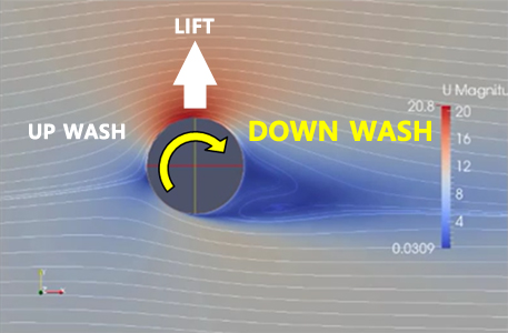 이와같은 현상은 흐르는 유체속에서 회전하는 원형 물체에서도 나타납니다. 위 영상과 사진에서 처럼 흐르는 유체속에서 회전하는 원형물체는 물체 주변의 유체흐름을 변화시켜 DOWN WASH를 만들어 냅니다. 그리고 DOWN WASH가 만들어지는 물체의 표면에서 유속이 가장 빠르다는 것을 알 수 있습니다. 이러한 유체흐름의 속도 변화와 그로 인한 DOWN WASH를 만들어낸 힘에 의해 에어포일에서의 양력과 같은 힘을 발생시키는데요, 이것을 'Magnus Force'라고 합니다. 그래서 아래 영상에서 처럼 회전하는 원통을 비행기의 날개대신 사용할 수도 있습니다.