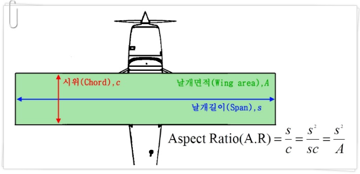폭이좁고 긴 날개를 가로세로비(Aspect ratio)가 큰 날개라고 말하는데요, 가로세로비는 날개길이(span)를 시위(chord)길이로 나눈 값 입니다.