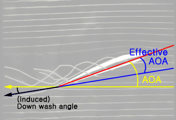 그런데 여기서 역으로 양력손실이 발생하지 않았다면 동일한 양력을 얻는데 더 작은 받음각이 필요하겠지요. 즉, 전체 받음각에서 실제로 양력에 영향을 주는 받음각은 더 작다는 말입니다. 이와같이 실제로 양력에 영향을 주는 받음각을 '유효 받음각(Effective AOA)'이라고 합니다.