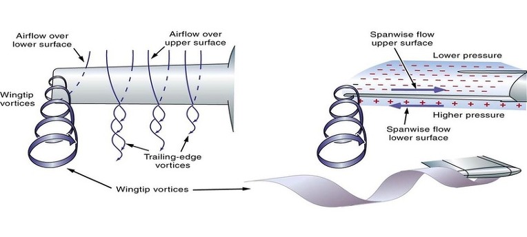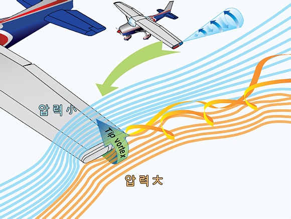 2차원 평면이 아닌 3차원 공간상에서는 공기는 '앞뒤상하' 뿐 아니라 '좌우'로도 흐를수 있습니다. 특히 날개의 윗면과 아랫면이 개방되어 있는 날개끝단에서 날개윗면과 아랫면의 압력차이로 인하여 아랫면의 상대적으로 높은압력의 공기가 윗면으로 이동하는 흐름이 발생하게 되는데요, 이 흐름이 날개 앞전에서 뒷전으로 흐르는 흐름에 더해져 일종의 소용돌이형태의 흐름(와류)이 만들어집니다.