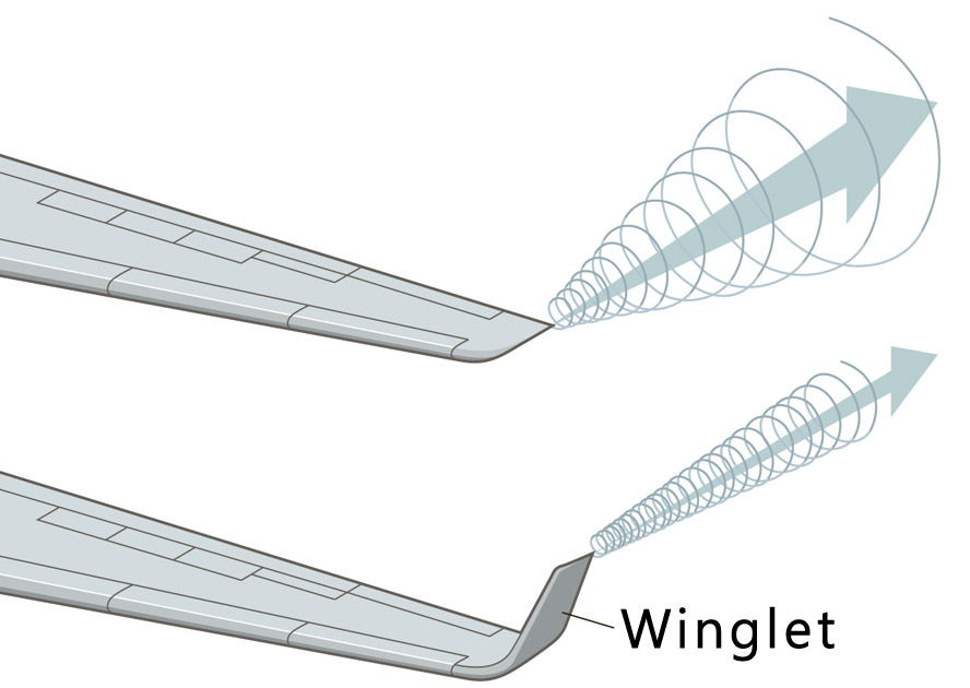 이와같은 목적으로 날개 끝단에 설치하는 장애물을 'Winglet' 이라고 합니다. Winglet 은 wing tip vortex 를 감소시켜줄 뿐 아니라 발생위치를 날개로 부터 어느정도 떨어뜨려 놓기때문에 그만큼 날개에 wing tip vortex 영향을 덜 받게 해줍니다.