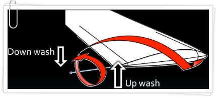 따라서 이렇게 만들어진 Down wash는 비록 날개 안쪽에 존재하더라도 양력의 반작용과는 관련이 없기 때문에 양력의 발생과는 상관이 없는 Down wash 입니다. 양력의 발생과 무관하기 때문에 이와같은 Down wash를 경우에 따라서는 'Induced down wash' 라고 부르기도 합니다.