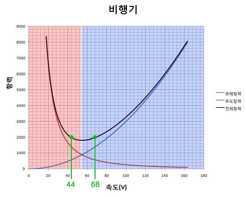 같은 논리로 위 항력곡선을 다시 살펴보면 속도 44 일 때와 속도 68 일 때의 항력은 같지만 파워(power) 요구량은 속도 68 을 유지할 때 더 많이 필요하다는 것을 알 수 있습니다.