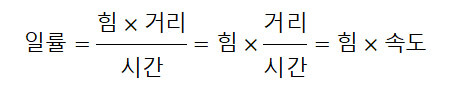 기본적으로 일률은 일을 시간으로 나눈 값입니다. 그리고 일은 힘에다 거리를 곱한 값입니다. 따라서 아래와 같은 식으로 바꿔볼 수 있습니다.