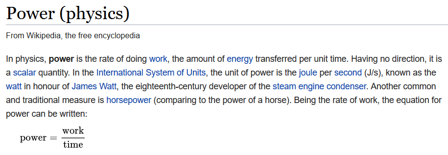 항력(Drag) 과 추력(Thrust)이 '힘(Force)'의 개념이라면, 파워(Power)는 '일(Work)'의 개념과 연관이 있습니다. 더 정확히는 일(work)을 시간(time)으로 나눈 '일률'을 나타냅니다. 즉, '파워 = 일률' 인 것이죠