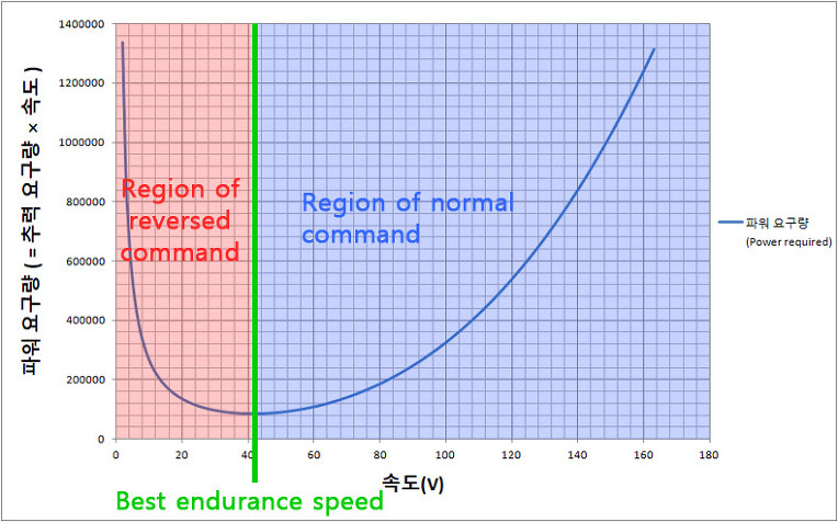 그래서 위 항력곡선 만으로는 파워 요구량이 가장 적은, 화학에너지(연료)를 가장 적게 쓰면서 가장 오랫동안 체공할 수 있는 속도를 구하기가 어렵습니다.
