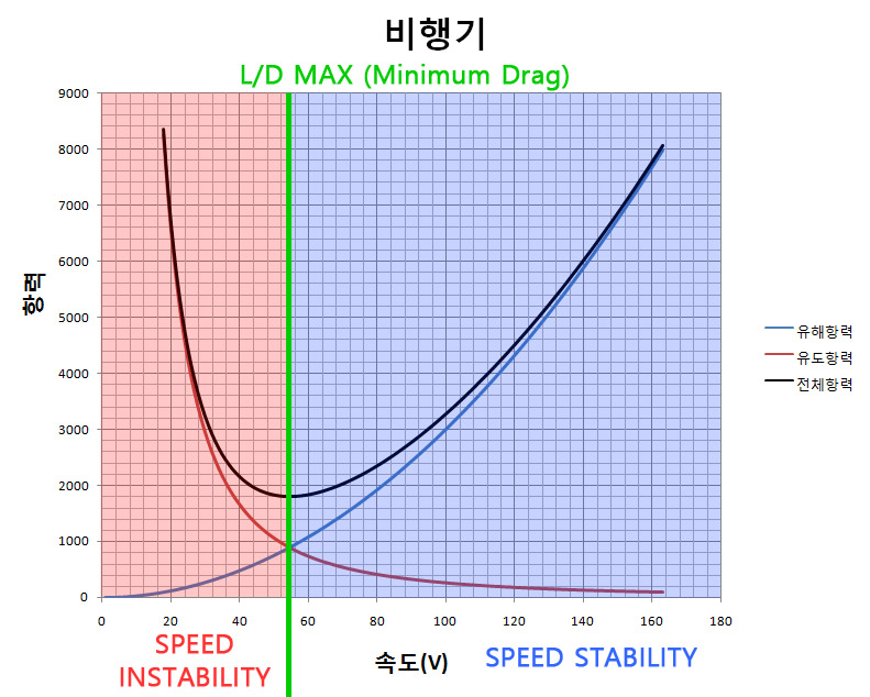 비행기는 유도항력이 존재하기 때문에 직진수평비행시 Best Glide(L/D Max) 속도 이하 구간에서 속도가 감소할수록 항력이 오히려 증가하는 현상이 나타납니다.