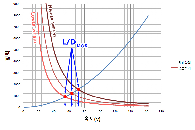 참고로 이러한 양항비가 최대가 되는 속도(Best glide speed)는 비행기의 무게가 증가하면 같이 증가하게 됩니다.