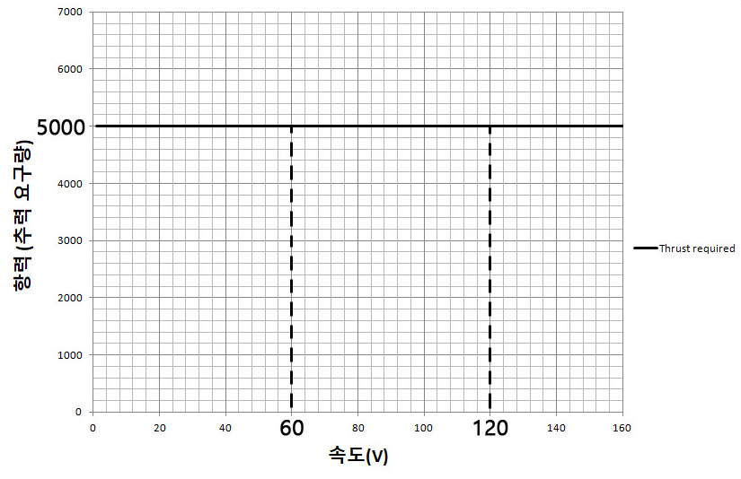 위 그래프는 속도에 따라 요구되는 추력의 양이 일정한 어떤 가상의 기기를 나타낸 그래프 입니다.