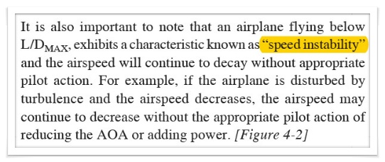 따라서 이 속도 구간에서는 더 낮은 속도를 유지하는데 더 높은 추력이 요구되며, 이 때 만약 외부요인에 의해 속도가 감소해 버리면 비행기가 받는 항력은 증가하게 되므로 받음각을 감소시켜 유도 항력을 줄이거나 파워 보충을 통해 추력을 보상하지 않으면 속도는 회복되지 않습니다. 이러한 특성을 Speed instability 라고 합니다.