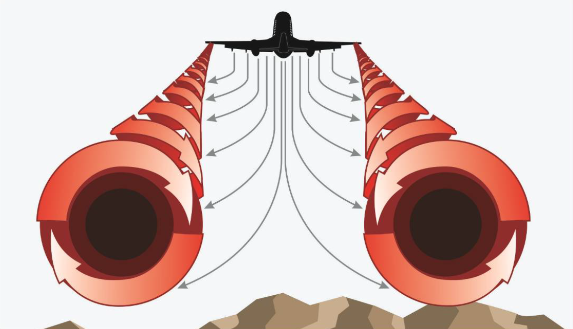 비행기가 비행 중일 때 날개에서는 'Wake turbulence'라는 소용돌이 난류를 만들어 냅니다.