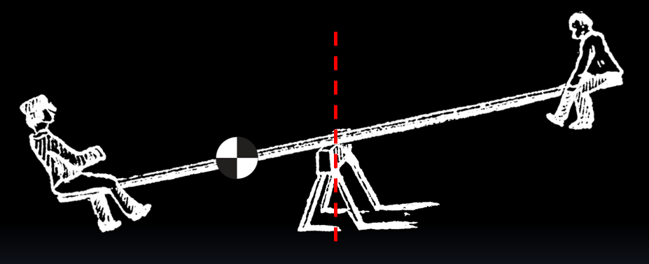 직관적으로 왼쪽에 있는 사람이 더 무겁다는 것을 알 수 있을 겁니다. 왜냐하면 왼쪽에 있는 사람이 오른쪽에 있는 사람보다 시소 받침대로 부터 더 가까이 있기 때문이죠. 그리고 시소가 어느 한쪽으로 기울어 지지 않았다는 말은 즉, 무게중심이 시소의 받침대 위에 있다는 말이 됩니다.