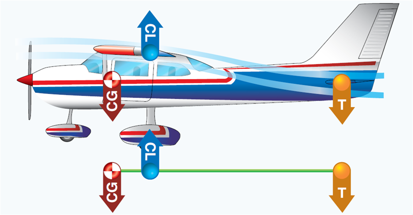 날개에 걸리는 양력중심(CP)을 시소를 위로 미는 사람, 그리고 꼬리에 달린 수평안정판(horizontal stabilizer)과 승강타(elevator)에서 발생하는 조종압(T)을 시소를 아래로 당기는 사람으로 볼 수 있습니다.