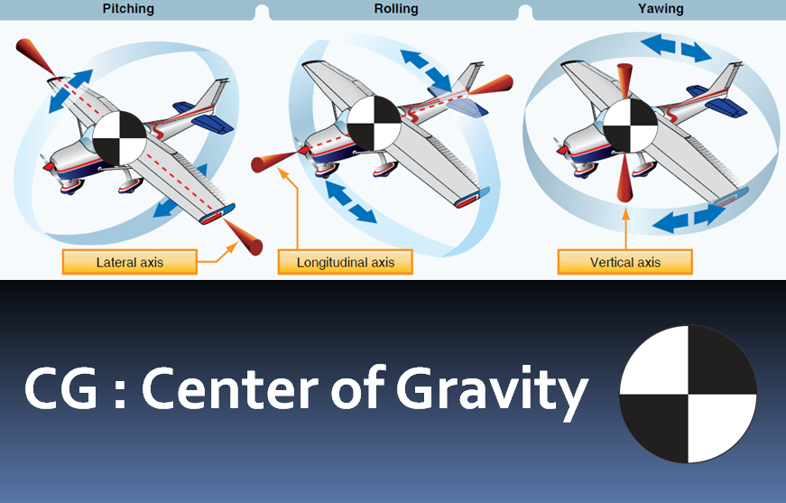 따라서 비행기는 궁극적으로 무게중심(CG : Center of Gravity)을 중심으로 복합적인 회전운동을 하게 됩니다. 물리과목에 관심이 있는 사람은 알겠지만 이것은 비단 비행기 뿐 아니라 공중에서 회전하는 모든 물체에 적용되는 이야기 입니다.