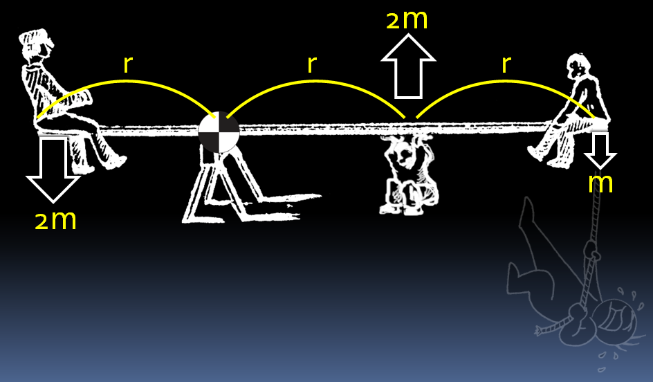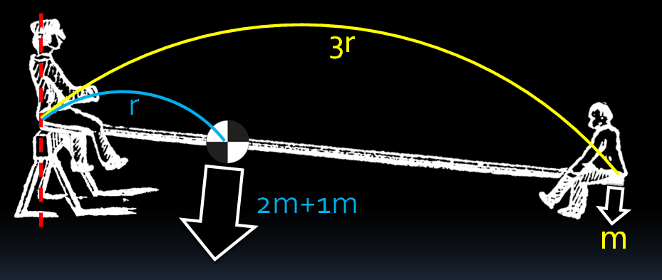 왼쪽 사람은 기준선으로 부터 거리가 0 이기 때문에 모멘트는 0 이 됩니다(0 × 2m = 0). 반면, 오른쪽 사람은 기준선으로 부터 거리가 늘어났기 때문에 모멘트는 커지게 됩니다(3r × m).