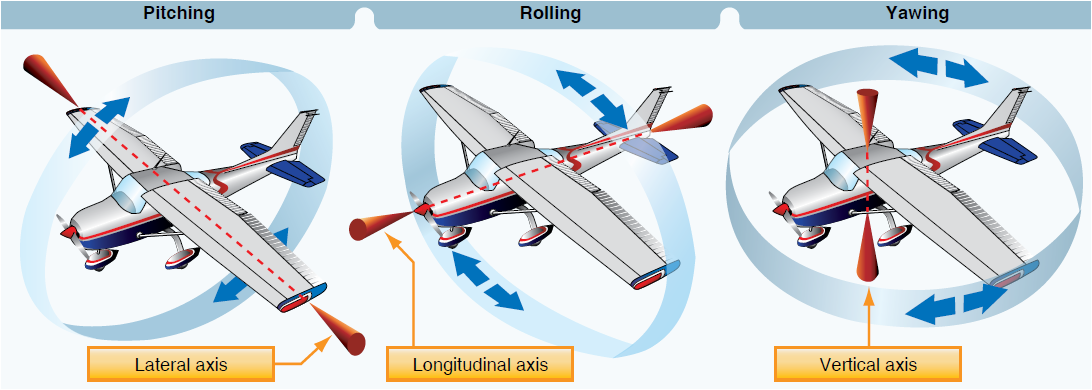 PITCHING 은 비행기의 한 쪽 날개 끝에서 반대 쪽 날개 끝 방향으로 가로 지르는 가로축(Lateral axis, x)을 중심으로 회전하는 운동이며, ROLLING 은 비행기의 기수와 꼬리를 관통하는 기축선, 또는 세로축(Longitudinal axis, y)을 중심으로 하는 회전 운동입니다. 마지막으로 YAWING 은 비행기 수직축(Vertical axis, z)을 중심으로 하는 회전 운동입니다.