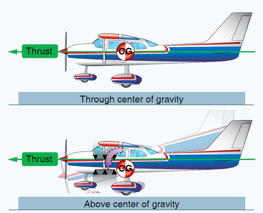 - The aircraft designer can offset this by establishing a “high thrust line” wherein the line of thrust passes above the CG. [Figures 5-26 and 5-27] In this case, as power or thrust is increased a moment is produced to counteract the down load on the tail.(PHAK p5-17) [본문으로]