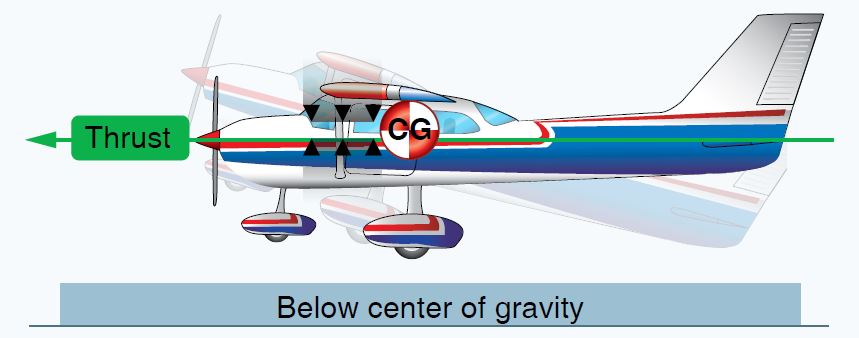 그래서 파워로 인한 기수들림 현상의 경우, 아래 그림과 같이, 추력선을 CG 위쪽에 위치시켜 똑같이 파워에 의해 기수를 내려가게 하는 모멘트를 만들어 상쇄시킬 수 있습니다.