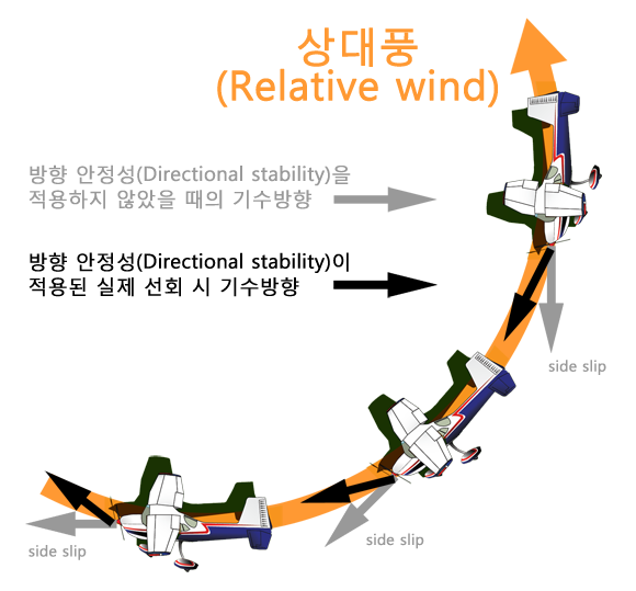 비행기의 방향안정성은 상대풍을 추종하게 하여 비행기의 날개가 기울어졌을때 사이드슬립대신 선회를 하게 합니다.