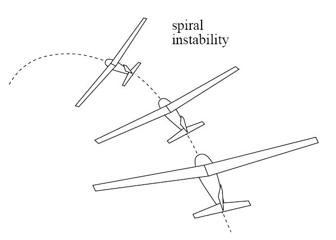 더치 롤과 반대로 Spiral instability는 방향안정성이 상대적으로 너무 강하거나 가로안정성이 상대적으로 부실할 때 나타나는 현상입니다.