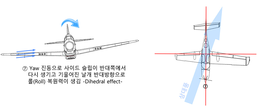 비행기가 상대풍을 정면에서 받고 있는 상태에서 어느 한쪽으로 Yaw 하게 되면 사이드슬립이 나타나게 됩니다. 그것이 Adverse yaw에 의한 것이든, 러더를 잘못 차서 만들어졌든, 가로안정성의 복원과정에서 만들어졌든 상관없습니다. 중요한 것은 이렇게 사이드슬립 상태에서 비행기가 방향안정성에 의해 다시 기수가 상대풍에 수렴할 때 동적안정성(dynamic stability)에 의한 큰 진동(overshoot)이 여러번 반복해서 나타날 수도 있다는 것입니다.