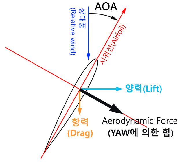 방향안정성이 완벽하지 않으면 비행기는 사이드슬립과 비슷하게 어느 한쪽으로 YAW하게 되어 상대풍을 비스듬하게 받게 됩니다. 이때 비행기의 동체를 하나의 에어포일로 보게되면 비스듬히 작용하는 상대풍과 받음각(AOA)이 만들어지게 되는데, 바로 이 받음각으로 인하여 비행기에는 에어포일에서의 공력학적인 힘(aerodynamic force)에 해당하는 힘이 나타나게 됩니다. (참고로 선박은 오로지 러더사용으로 나타나는 이 힘에서 구심력을 얻어 선회를 합니다.)