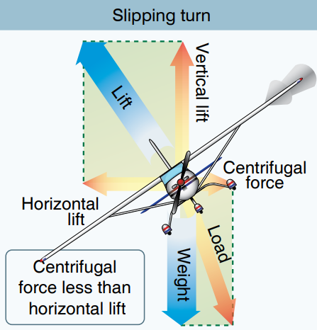 어떻게 보면 사이드슬립과 비슷하지만, 날개 양력의 수평성분과 YAW에 의한 힘이 평형을 이뤄 기수의 방향이 일정한 사이드 슬립과 달리 Slipping 선회는 날개 양력의 수평성분이 YAW에 의한 힘과 평형을 이루지 않고 더 강하여 그 일부가 원운동의 구심력으로 작용하기 때문에 기수의 방향이 계속해서 변한다는 차이가 있습니다.
