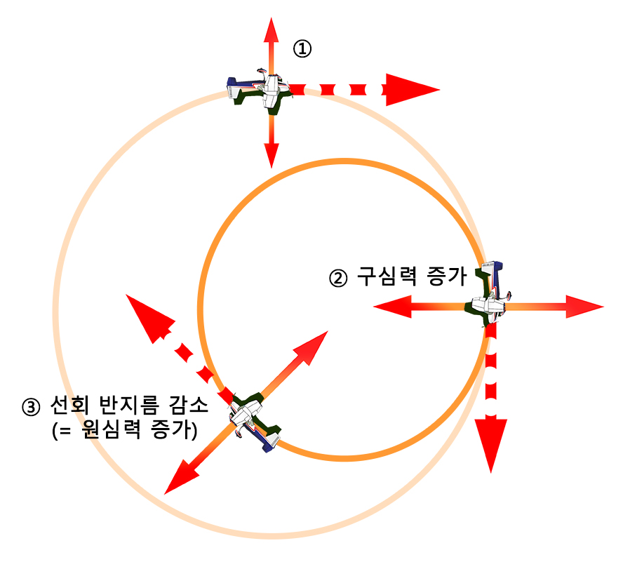 또한 구심력이 증가하였기 때문에 정상 선회보다 좁은 선회 반지름을 가지게 됩니다. 마치 자동차가 드리프트로 급커브를 도는 것과 비슷한 이치입니다.