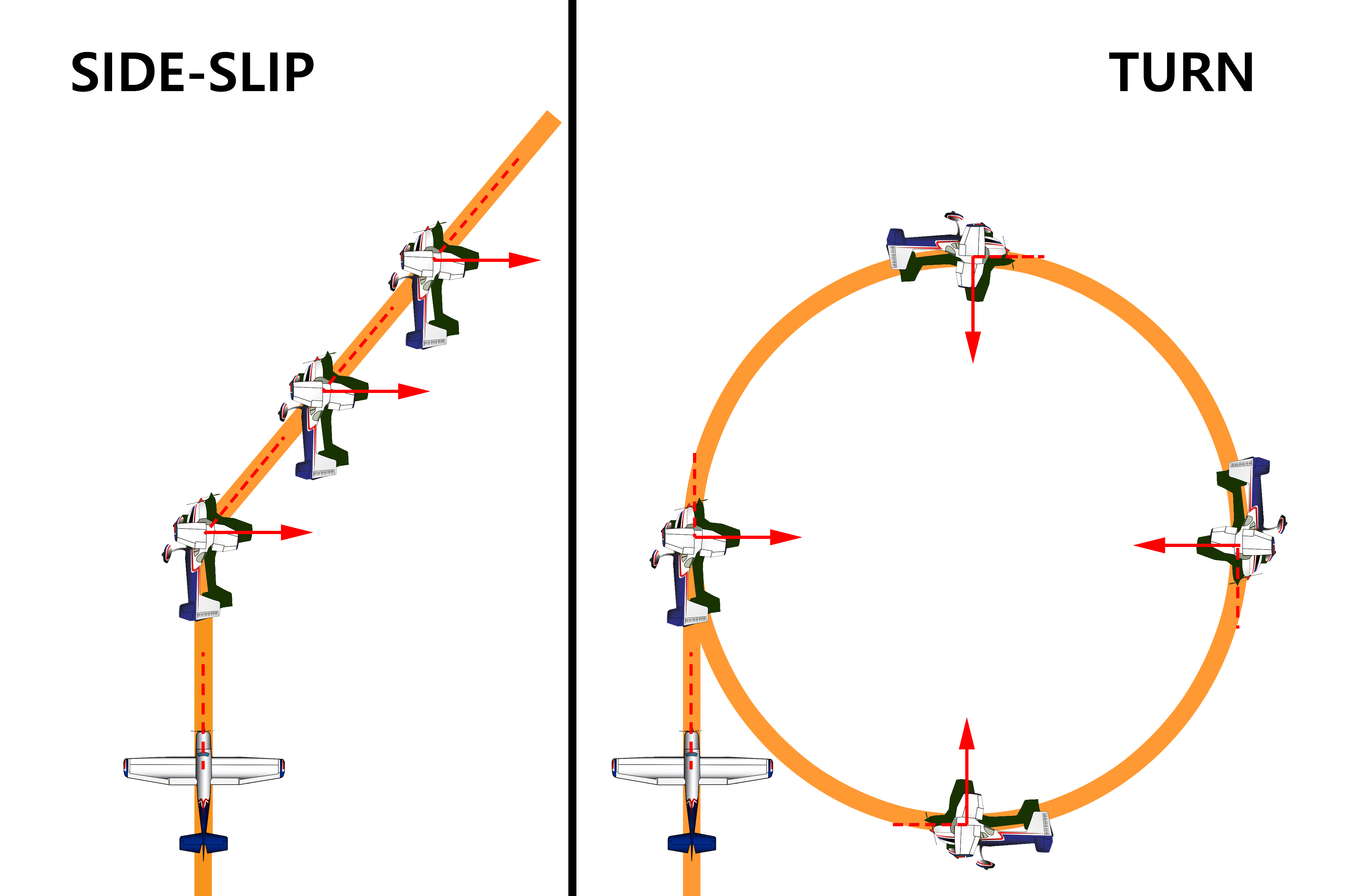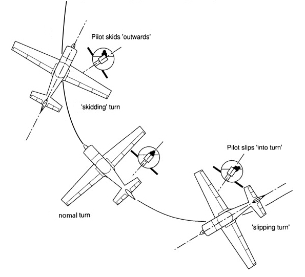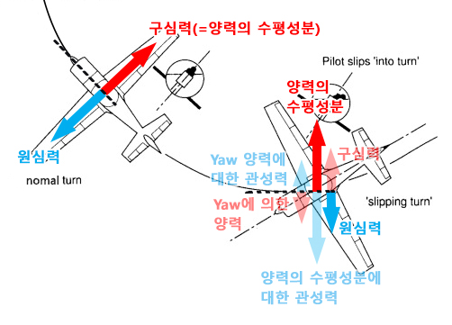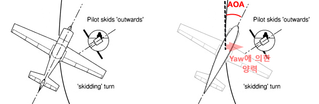 이러한 힘, 즉 'YAW에 의한 힘'이 나타나게 되면 비행기의 선회는 불필요한 항력 및 연료의 비대칭적인 소모를 동반하면서 반지름이 정상적인 선회보다 크거나 작은 선회가 될 수 있는데, 바로 'Slipping 선회' 와 'Skidding 선회' 입니다.