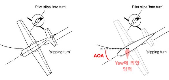 Slipping 선회는 기수가 선회경로 바깥쪽으로 돌아간(yaw) 상태를 말합니다.