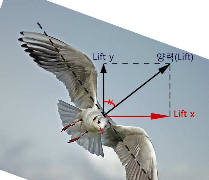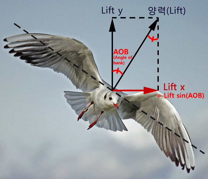 비행 중 날개가 기울어지면(bank), 거기서 발생하는 양력도 기울어지게 됩니다. 그리고 이렇게 기울어진 양력의 일부는 수평방향으로 작용하는 힘(Lift x)을 만들어 내게 됩니다.