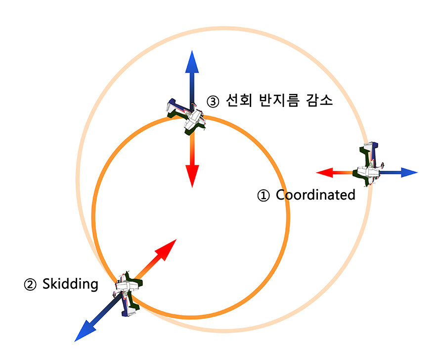 또한 구심력이 감소하였기 때문에 정상 선회보다 넓은 선회 반지름을 가지게 됩니다.