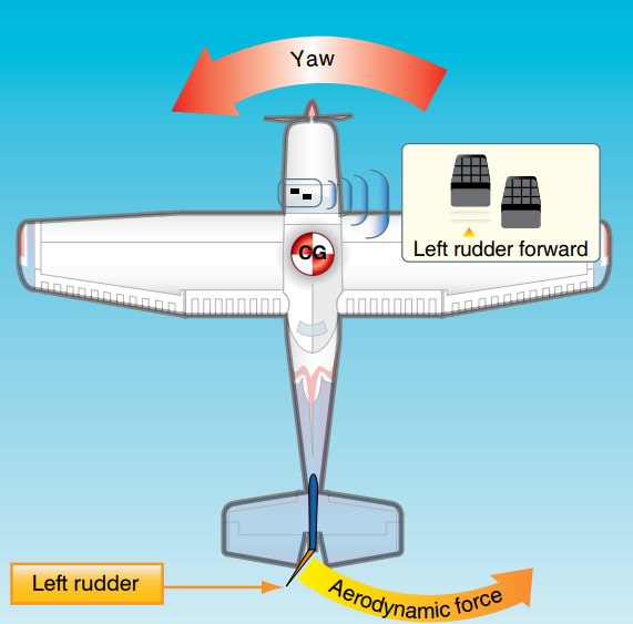 선회 중 YAW가 생기게 되는 원인은 다양합니다. 다양한 원인들이 있기 때문에 비행기가 가진 방향안정성만으로는 선회경로를 유지하는데 한계가 있습니다. 따라서 조종사는 '러더(rudder)'를 사용하여 선회를 보조해야 합니다.