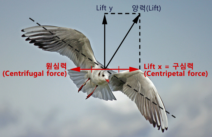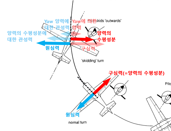 비행기가 선회를 하게 되면 양력의 수평성분이 비행기의 운동 방향과 수직으로 작용하여 '구심력(Centripetal force)'이 되고, 그러한 구심력에 대한 관성력으로서 '원심력(Centrifugal force)'이 나타나게 됩니다.