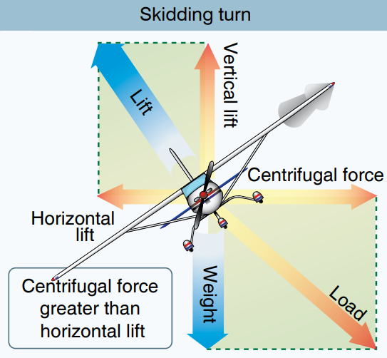 Skidding 선회에서 벗어나려면 bank를 증가시켜 양력의 수평성분과 구심력을 일치시키거나, 선회율을 감소시켜 구심력을 양력의 수평성분에 맞추거나, 아니면 두가지 방법을 모두 사용하여 선회 경로 밖으로 벗어난 기수를 선회 경로와 일치시켜 YAW로 인한 힘을 없애줘야 합니다.