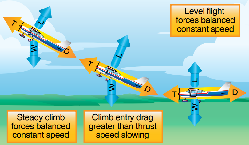 따라서 동일한 속력을 계속 유지하기 위해서는 수평비행을 할때 보다 더 많은 추력이 필요하게 되며, 만약 추력을 보충하지 않으면 비행기의 속력은 전체항력이 추력과 같아질 때까지 줄어들게 됩니다.