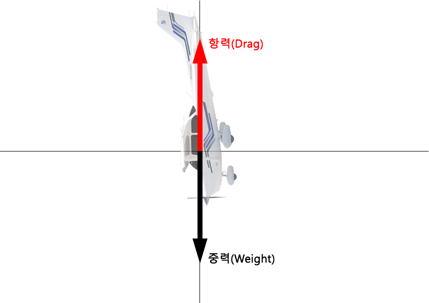 수평으로 작용하는 힘의 총 합: Thrust - Drag = 0 (잉여추력 0)