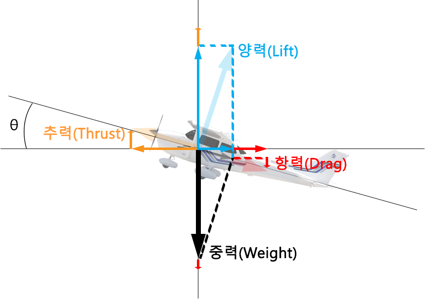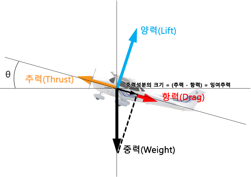 (Thrust - Drag)×sinθ + Lift×cosθ = (잉여추력)×sinθ + Lift×cosθ = Weight