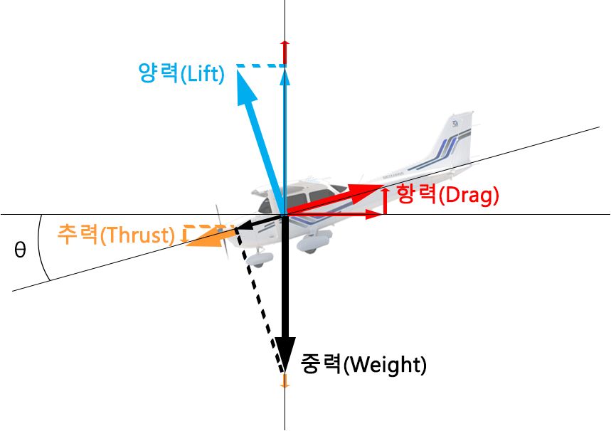 θ가 0이 아닐 때(상승비행을 할 때),
