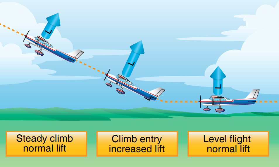 직진수평비행에서 상승비행으로 전환하기 위해서는 제일먼저 양력이 증가하여야 합니다. 중력보다 큰 양력은 항공기를 위로 가속시키게 되며 직진경로를 상승경로로 변화시키게 됩니다.