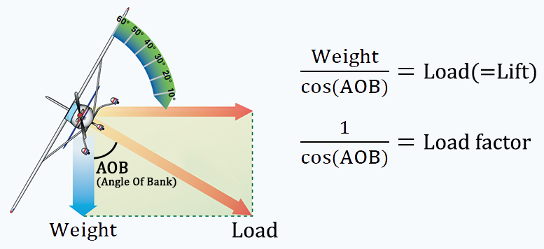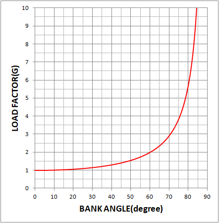 선회 중 Bank와 실속속도의 관계를 정의하기에 앞서, 먼저 Bank량과 하중의 관계를 살펴보면 다음과 같습니다.